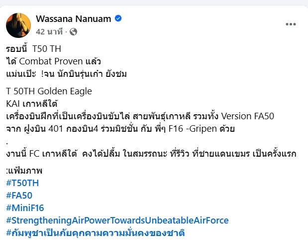 ล่าสุด พี่เล็ก วาสนา นาน่วม นักข่าวอาวุโสสายทหาร โพสต์ข้อความผ่านเฟซบุ๊ก โดยระบุว่า รอบนี้ T50 TH ได้ Combat Proven แล้ว