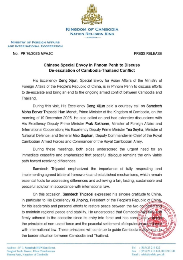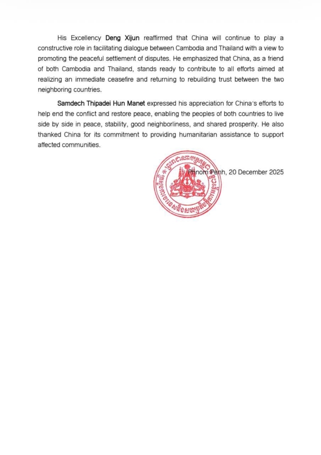 โดยระบุว่า ระหว่างการเยือนครั้งนี้ เมื่อช่วงเช้าวันที่ 19 ธันวาคม 2025 นายเติ้ง ซีจวิน ได้พบหารือกับนายฮุน มาเนต นายกรัฐมนตรีแห่งราชอาณาจักรกัมพูชา