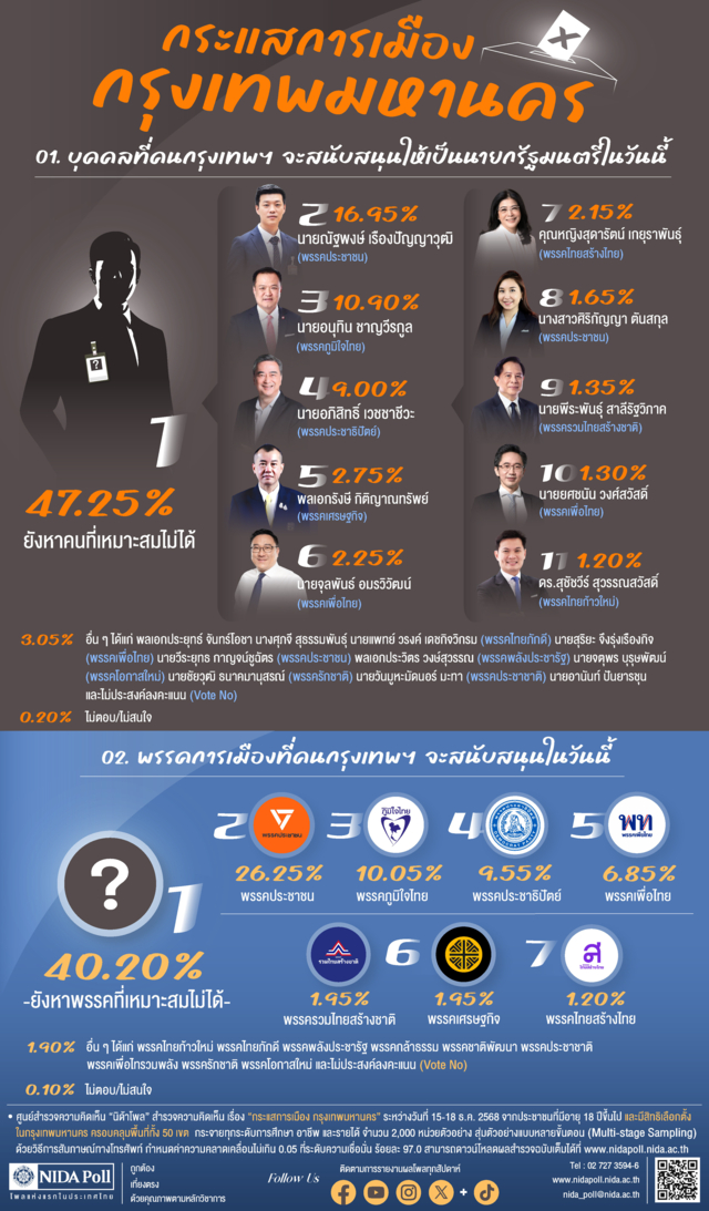 ศูนย์สำรวจความคิดเห็น “นิด้าโพล” สถาบันบัณฑิตพัฒนบริหารศาสตร์ (นิด้า) เปิดเผยผลการสำรวจ เรื่อง “กระแสการเมือง กรุงเทพมหานคร” ทำการสำรวจระหว่างวันที่ 15-18 ธันวาคม 2568 จากประชาชนที่มีอายุ 18 ปีขึ้นไป และมีสิทธิเลือกตั้งในกรุงเทพมหานคร ครอบคลุมพื้นที่ทั้ง 50 เขต กระจายทุกระดับการศึกษา อาชีพ และรายได้ รวมจำนวนทั้งสิ้น 2,000 หน่วยตัวอย่าง เกี่ยวกับกระแสการเมือง กรุงเทพมหานคร การสำรวจอาศัยการสุ่มตัวอย่างโดยใช้ความน่าจะเป็นจากบัญชีรายชื่อฐานข้อมูลตัวอย่างหลัก (Master Sample) ของ “นิด้าโพล” สุ่มตัวอย่างแบบหลายขั้นตอน (Multi-stage Sampling) เก็บข้อมูลด้วยวิธีการสัมภาษณ์ทางโทรศัพท์ โดยกำหนดค่าความคลาดเคลื่อนไม่เกิน 0.05 ที่ระดับความเชื่อมั่น ร้อยละ 97.0