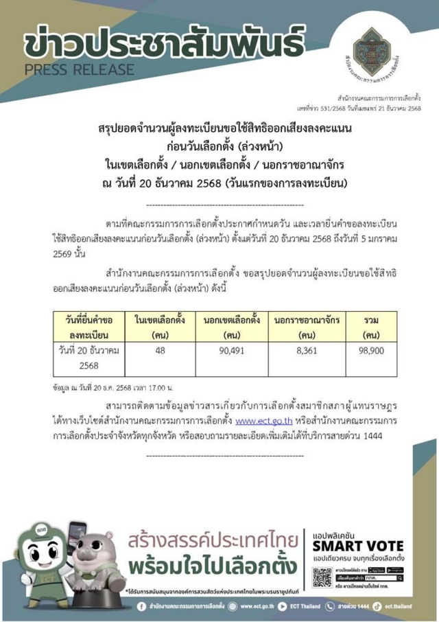 สำนักงานคณะกรรมการการเลือกตั้ง (กกต.) เผยแพร่ข้อมูลว่าผู้มายื่นขอลงทะเบียนใช้สิทธิเลือกตั้งล่วงหน้า ทั้งในเขตเลือกตั้ง นอกเขตเลือกตั้ง และนอกราชอาณาจักร เมื่อวานนี้ (20 ธ.ค.) ซึ่งเป็นวันแรกของการเปิดให้ลงทะเบียนขอใช้สิทธิเลือกตั้งล่วงหน้า ปรากฏว่า มีผู้ลงทะเบียนขอใช้สิทธิเลือกตั้งล่วงหน้า รวมจำนวน 98,900 คน โดยเป็นผู้ลงทะเบียนขอใช้สิทธิเลือกตั้งในเขต ซึ่งเป็นเจ้าหน้าที่ที่ได้รับมอบหมายให้ปฏิบัติงานในวันเลือกตั้ง จำนวน 48 คน ผู้ลงทะเบียนเลือกตั้งนอกเขตเลือกตั้ง จำนวน 90,491 คน และผู้ลงทะเบียนนอกราชอาณาจักร จำนวน 8,361 คน