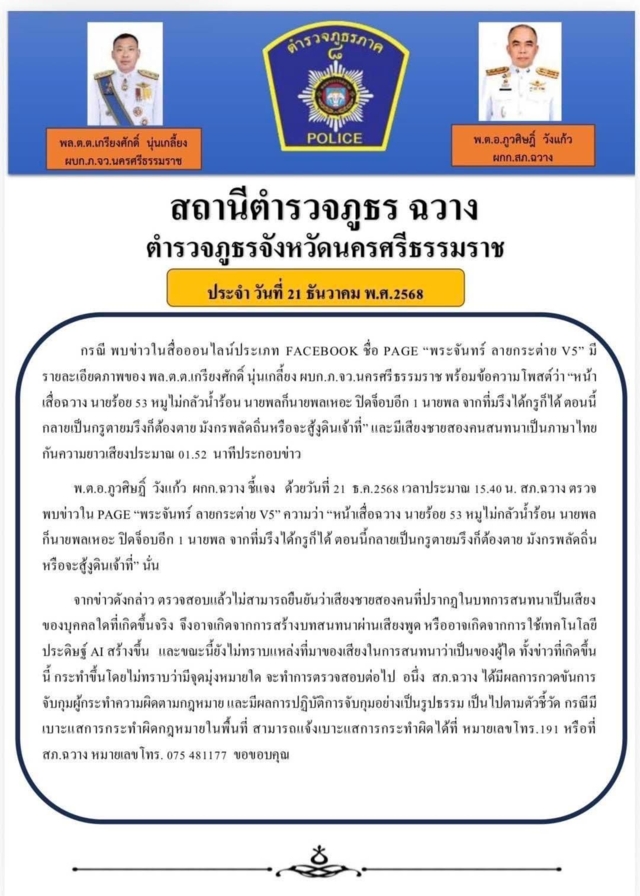 “พ.ต.อ.ภูวศิษฐ์ วังแก้ว ผกก.สภ.ฉวาง ชี้แจงว่า ด้วยวันที่ 21 ธ.ค.2568 เวลาประมาณ 15.40 น. สภ.ฉวาง ตรวจพบข่าวใน PAGE “พระจันทร์ ลายกระต่าย V5” ความว่า “หน้าเสื่อฉวาง นายร้อย 53 หมูไม่กลัวน้ำร้อน นายพลก็นายพลเหอะ ปิดจ็อบ อีก 1 นายพล จากที่มรึงได้กรูก็ได้ ตอนนี้กลายเป็นกรูตายมรึงก็ต้องตาย มังกรพลัดถิ่น หรือจะสู้งูดินเจ้าที่” นั้น