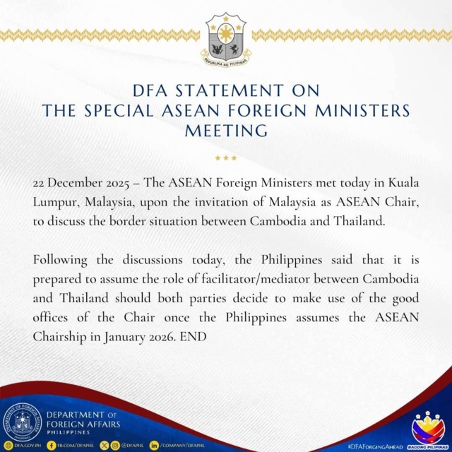 วันที่ 22 ธันวาคม ที่ผ่านมา เพจเฟซบุ๊ก กระทรวงการต่างประเทศ สาธารณรัฐฟิลิปปินส์ ได้ออกแถลงการณ์ DFA เกี่ยวกับการประชุมรัฐมนตรีต่างประเทศพิเศษอาเซียน ในวันที่ 22 ธ.ค. ณ กรุงกัวลาลัมเปอร์ ประเทศมาเลเซีย ตามคำเชิญของมาเลเซียในฐานะประธานอาเซียน เพื่อหารือเกี่ยวกับสถานการณ์ชายแดนระหว่างกัมพูชาและประเทศไทย