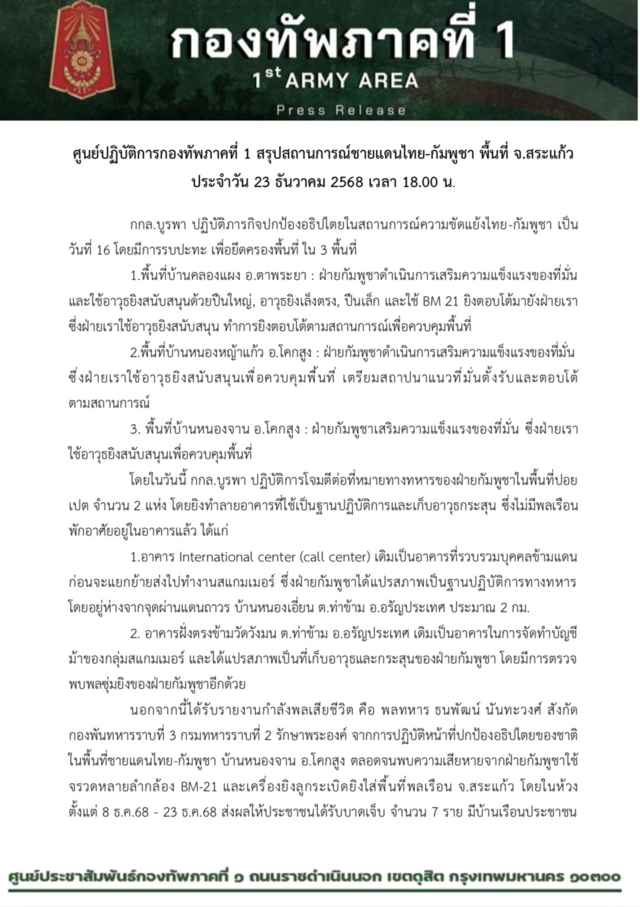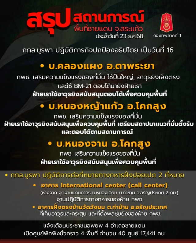 ศูนย์ปฏิบัติการกองทัพภาคที่ 1 สรุปสถานการณ์ชายแดนไทย-กัมพูชา พื้นที่ จ.สระแก้วประจำวัน 23 ธันวาคม 2568 เวลา 18.00 น.