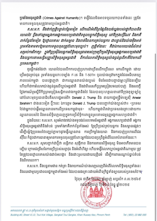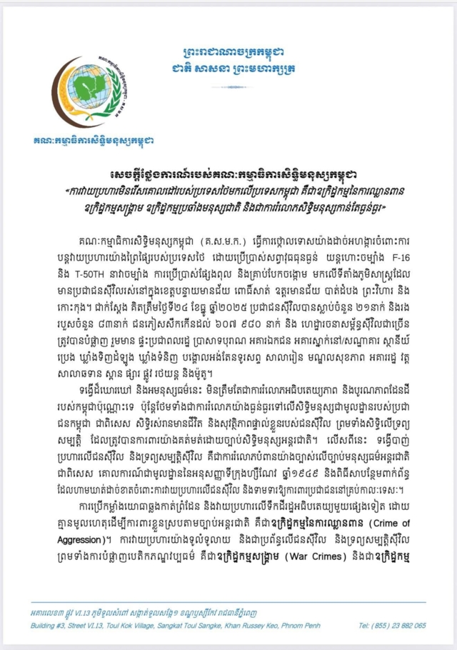คณะกรรมการสิทธิมนุษยชนแห่งกัมพูชา ขอประณามอย่างรุนแรงที่สุดต่อการโจมตีอย่างต่อเนื่องของฝ่ายไทย โดยใช้อาวุธหนัก เครื่องบินขับไล่ F-16 และ T-50TH รถถัง การใช้สารพิษ และระเบิดพวง มายังพื้นที่ภูมิศาสตร์ที่มีพลเรือนอาศัยอยู่ในจังหวัดบันเตียเมียนเจย โพธิสัตว์ อุดรมีชัย พระตะบอง พระวิหาร และเกาะกง โดยเฉพาะอย่างยิ่ง ข้อมูล ณ วันที่ 24 ธันวาคม พ.ศ. 2568 มีพลเรือนเสียชีวิตจำนวน 217 ราย และบาดเจ็บจำนวน 837 ราย ผู้อพยพเพิ่มขึ้นถึง 60,950 ราย และโครงสร้างพื้นฐานของพลเรือนจำนวนมากถูกทำลาย รวมถึงบ้านเรือนของประชาชน ปราสาทโบราณ อาคารพาณิชย์ โรงแรม/ที่พัก สถานีน้ำมัน คลังสินค้า โรงสีข้าว โรงพยาบาล สถานศึกษา ศูนย์สุขภาพ อาราม วัด โรงอาหาร ตลาด ถนน รถยนต์ และมอเตอร์ไซค์