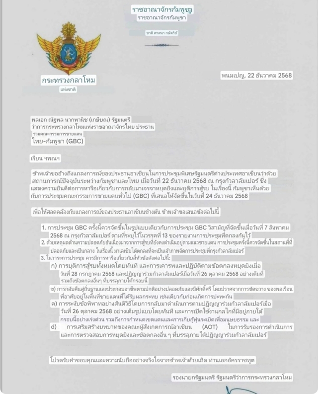 จากกรณี กระทรวงกลาโหมกัมพูชาได้มีหนังสืออย่างเป็นทางการถึง รมว.กลาโหมของไทย เพื่อแสดงความประสงค์ในการเจรจาหยุดยิงผ่านกลไก GBC โดยไทยย้ำว่าต้องพิสูจน์ความจริงใจผ่าน 3 เงื่อนไขเหล็ก ก่อนลงนามสันติภาพในวันที่ 27 ธ.ค. 68 ตามที่มีการนำเสนอข่าวไปก่อนหน้านี้