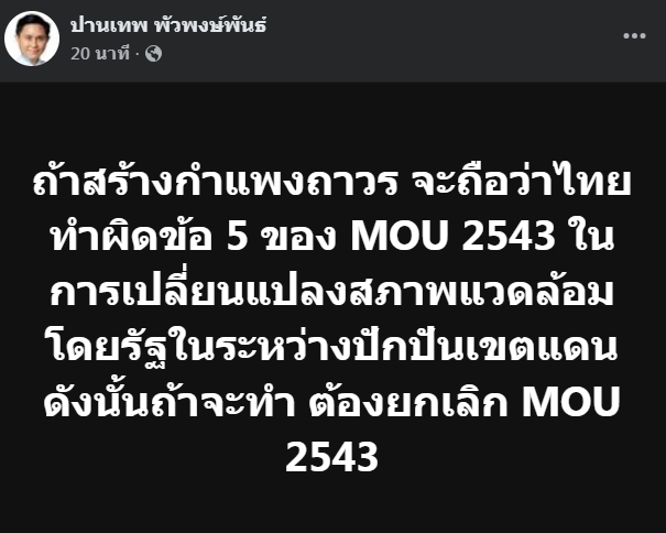 ถ้าสร้างกำแพงถาวร จะถือว่าไทยทำผิดข้อ 5 ของ MOU 2543 ในการเปลี่ยนแปลงสภาพแวดล้อมโดยรัฐในระหว่างปักปันเขตแดน ดังนั้นถ้าจะทำ ต้องยกเลิก MOU 2543