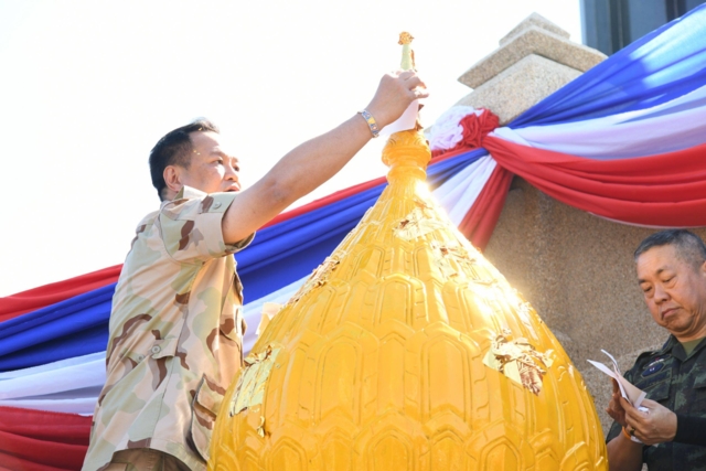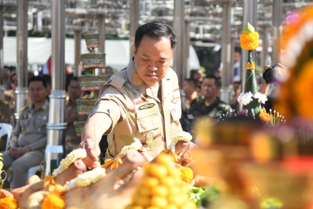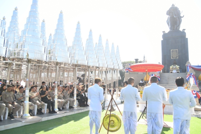 โอกาสนี้ นายกรัฐมนตรี ได้ขึ้นสักการะพระบรมราชานุสาวรีย์พระบาทสมเด็จพระพุทธยอดฟ้าจุฬาโลกมหาราช พร้อมจุดธูปเทียนบูชาเครื่องบวงสรวง ขณะที่รัฐมนตรีช่วยว่าการกระทรวงกลาโหมและครูใหญ่พรรคภูมิใจไทย ร่วมปักธูปบนเครื่องสังเวย พร้อมสวดบทบูชาพระรัตนตรัย บทชุมนุมเทวดา และบทถวายเครื่องสังเวย จากนั้นพราหมณ์บรรเลงดนตรี เพลงบาทสกุณี และนายกรัฐมนตรีโปรยดอกไม้ใส่เครื่องบวงสรวง จากนั้นระหว่างที่พระสงฆ์กำลังสวดบทชะยันโต นายอนุทิน และนายเนวิน ได้ปิดทองที่ยอดพุ่มเงินพุ่มทอง ทั้งสี่ทิศของอนุสาวรีย์ จากนั้นได้มาปิดทองที่ฐานฉัตรแก้ว ต้นที่ 37 จากนั้นนายกรัฐมนตรีและผู้ร่วมพิธีจะได้มารุมกันปิดทองที่ฐานฉัตรต้นที่ 37