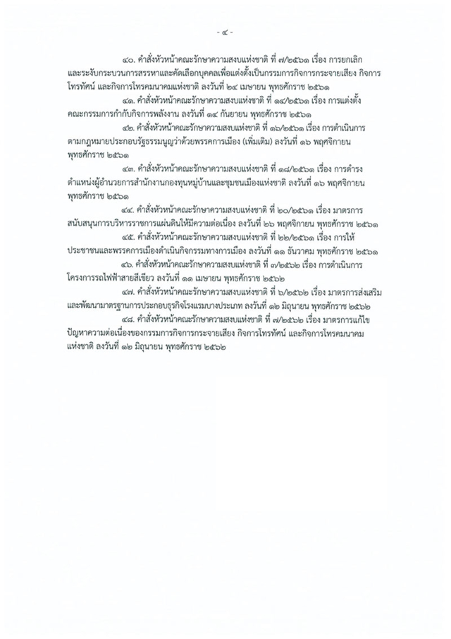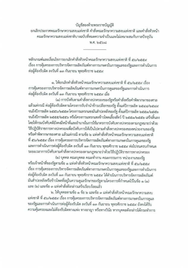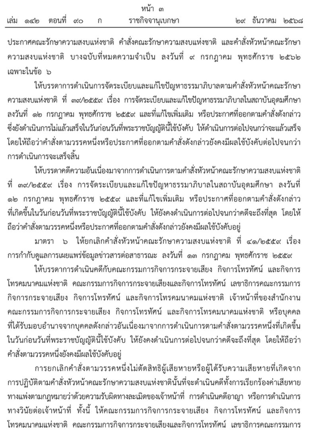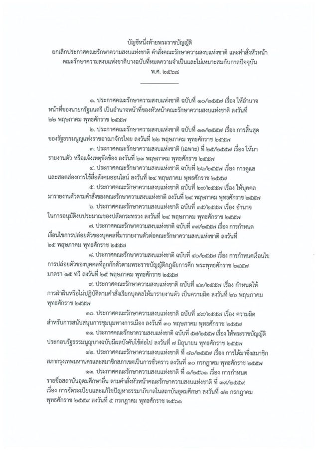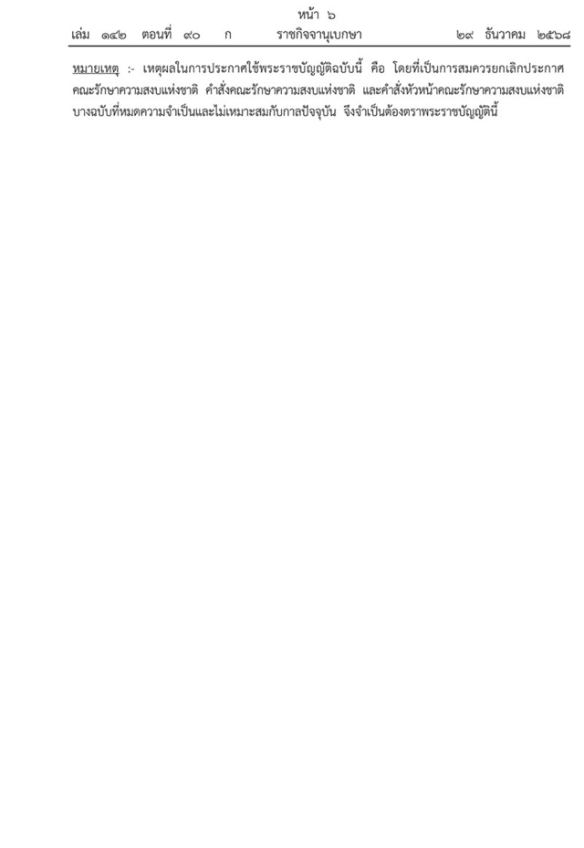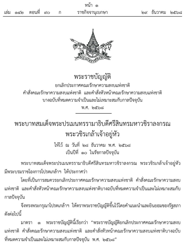 วันที่ 30 ธ.ค. 68 เว็บไซต์ ราชกิจจานุเบกษา ได้เผยแพร่ พ.ร.บ.ยกเลิกประกาศคณะรักษาความสงบแห่งชาติ คำสั่งคณะรักษาความสงบแห่งชาติ และ คำสั่งหัวหน้าคณะรักษาความสงบแห่งชาติบางฉบับ ที่หมดความจำเป็นและไม่เหมาะกับกาลปัจจุบัน