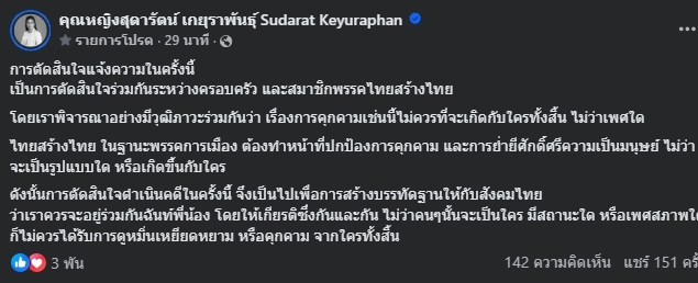 ขณะที่ คุณหญิงสุดารัตน์ เกยุราพันธุ์ หัวหน้าพรรคไทยสร้างไทย โพสต์ข้อความโดยระบุว่า การตัดสินใจแจ้งความในครั้งนี้เป็นการตัดสินใจร่วมกันระหว่างครอบครัว และสมาชิกพรรคไทยสร้างไทย โดยเราพิจารณาอย่างมีวุฒิภาวะร่วมกันว่า เรื่องการคุกคามเช่นนี้ไม่ควรที่จะเกิดกับใครทั้งสิ้น ไม่ว่าเพศใด