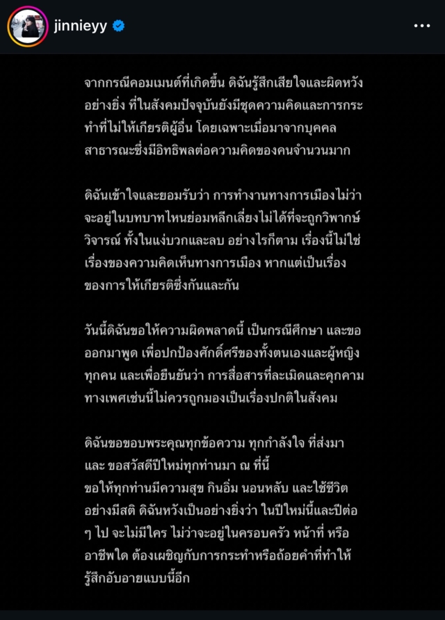 ดิฉันขอขอบพระคุณทุกข้อความ ทุกกำลังใจ ที่ส่งมา และ ขอสวัสดีปีใหม่ทุกท่านมา ณ ที่นี้ ขอให้ทุกท่านมีความสุข กินอิ่ม นอนหลับ และใช้ชีวิตอย่างมีสติ ดิฉันหวังเป็นอย่างยิ่งว่า ในปีใหม่นี้และปีต่อ ๆ ไป จะไม่มีใคร ไม่ว่าจะอยู่ในครอบครัว หน้าที่ หรืออาชีพใด ต้องเผชิญกับการกระทำหรือถ้อยคำที่ทำให้รู้สึกอับอายแบบนี้อีก”