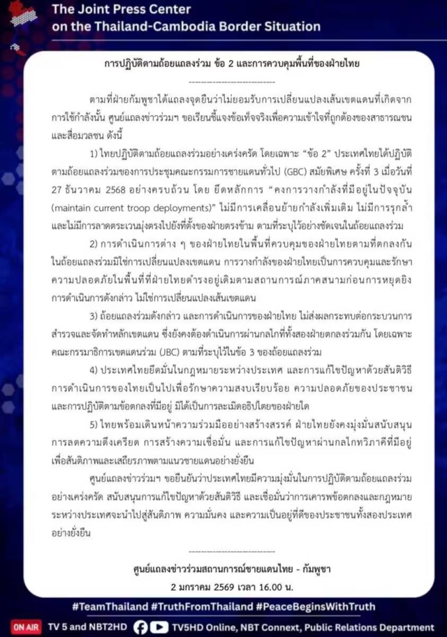 1.ไทยปฏิบัติตามถ้อยแถลงร่วมอย่างเคร่งครัด โดยเฉพาะ “ข้อ 2” ประเทศไทยได้ปฏิบัติตามถ้อยแถลงร่วมของการประชุมคณะกรรมการชายแดนทั่วไป (GBC) สมัยพิเศษ ครั้งที่ 3 เมื่อวันที่ 27 ธ.ค.2568 อย่างครบถ้วน โดยยึดหลักการ “คงการวางกำลังที่มีอยู่ในปัจจุบัน (maintain current troop deployments)” ไม่มีการเคลื่อนย้ายกำลังเพิ่มเติม ไม่มีการรุกล้ำและไม่มีการลาดตระเวนมุ่งตรงไปยังที่ตั้งของฝ่ายตรงข้าม ตามที่ระบุไว้อย่างชัดเจนในถ้อยแถลงร่วม
