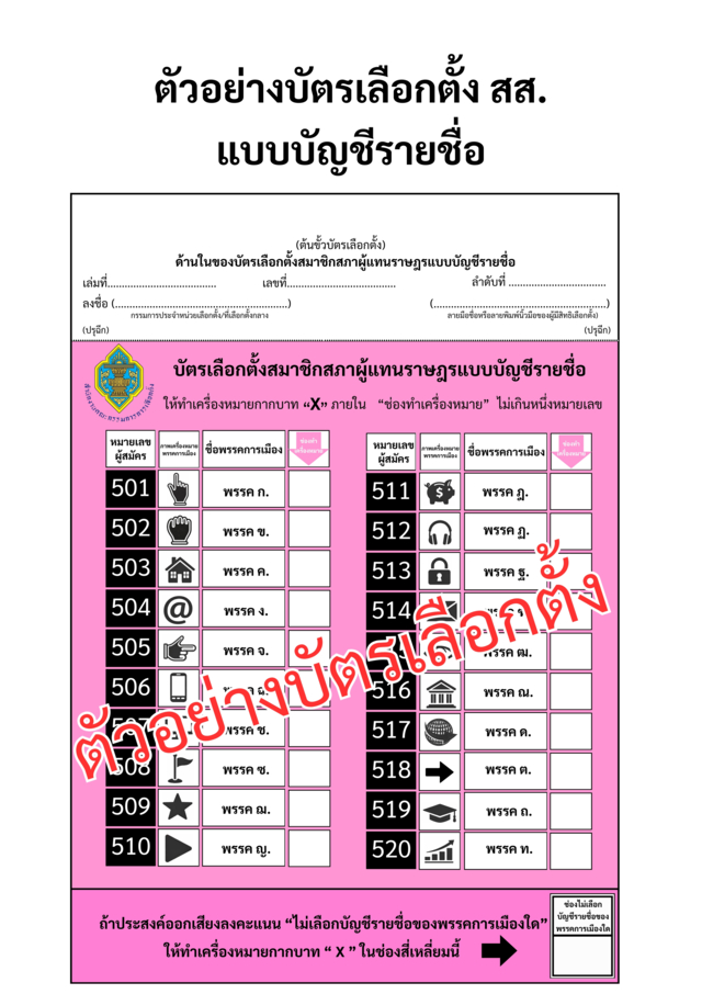 1. บัตรสีชมพู = เลือกตั้ง สส.บัญชีรายชื่อ (ปาร์ตี้ลิสต์) เลือกได้ไม่เกิน 1 หมายเลข