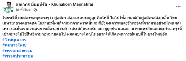 โดย ทนายไวท์ ได้โพสต์ข้อความบนเฟซบุ๊กด้วยว่า "ในกรณีนี้ ผมต้องขอพูดตรงๆ ว่า ผู้สมัคร สส.ควรอบรมดูลูกทีมให้ดี ไม่ไปใช้อารมณ์กับผู้สมัครสส.คนอื่น โดยเฉพาะกลางตลาดสด ในฐานะที่ผมก็จากมาจากพรรคนั้นผมก็ยังคงเคารพและรักพรรคที่จากมา(อย่างมีเหตุผล) เพราะฉะนั้นเราควรเล่นการเมืองอย่างสร้างสรรค์กันนะครับ อย่าดูถูกกัน และอย่ามาข่มเหงกันเลยนะครับ...พรุ่งนี้เช้าผมจะไปใช้สิทธิตามกฎหมายต่อไป ผมคนบางใหญ่ไม่อยากให้เกิดเหตุการณ์แบบนี้ในบางใหญ่อีก"
