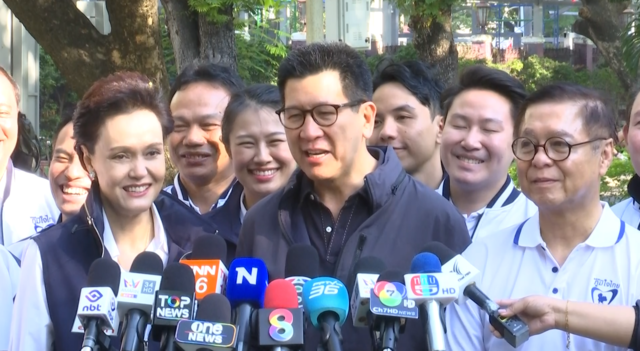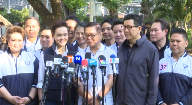 จากนั้นเวลาแกนนำยังได้เดินทักทาย ชาวบ้าน ที่มาจับจ่ายบริเวณตลาดเช้าด้านหน้าสวนลุมพินีด้วย