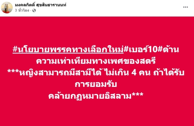 วันที่ 13 ม.ค.2569 นายมงคลกิตติ์ สุขสินธารานนท์ แคนดิเดตนายกฯพรรคทางเลือกใหม่ โพสต์เฟซบุ๊ก เปิดนโยบายพรรคทางเลือกใหม่ เรื่องความเท่าเทียมทางเพศของสตรี โดยระบุว่า ผู้หญิงสามารถมีสามีได้ไม่เกิน 4 คน ถ้าได้รับการยอมรับ คล้ายกฎหมายอิสลาม