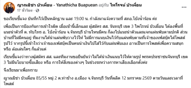 เรียนชี้แจงว่าทางผู้สมัคร สส. และทีมงานขอยืนยันว่าไม่ได้นำเงินแนบไว้ให้ตามรูป พรรคประชาชนจันทบุรี เขต 3 ไม่มีนโยบายซื้อเสียง หรือ การให้สิ่งของต่างๆ ในช่วงระหว่างการหาเสียงเลือกตั้งค่ะ