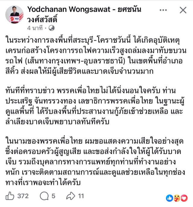 นายยศชนัน วงศ์สวัสดิ์ แคนดิเดตนายกรัฐมนตรี พรรคเพื่อไทย ได้โพสต์ข้อความผ่านเฟซบุ๊ก Yodchanan Wongsawat - ยศชนัน วงศ์สวัสดิ์ ว่า ในระหว่างการลงพื้นที่สระบุรี-โคราชวันนี้ ได้เกิดอุบัติเหตุเครนก่อสร้างโครงการรถไฟความเร็วสูงถล่มลงมาทับขบวนรถไฟ (เส้นทางกรุงเทพฯ-อุบลราชธานี) ในเขตพื้นที่อำเภอสีคิ้ว ส่งผลให้มีผู้เสียชีวิตและบาดเจ็บจำนวนมาก