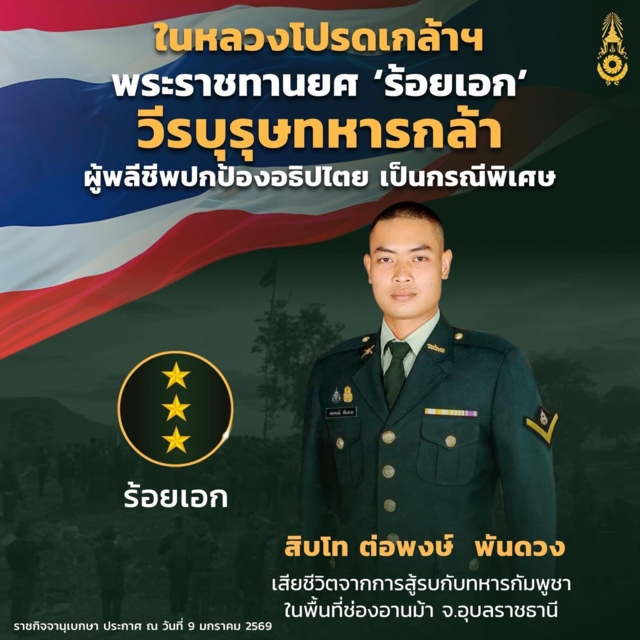 จากสถานการณ์การสู้รบบริเวณพื้นที่ชายแดนไทย-กัมพูชา ซึ่งก่อให้เกิดความสูญเสียแก่กำลังพลของกองทัพบก ผู้ซึ่งอุทิศชีวิตในการปฏิบัติหน้าที่ด้วยความกล้าหาญ เพื่อพิทักษ์รักษาอธิปไตยของชาติ และคุ้มครองความปลอดภัยของพี่น้องประชาชน