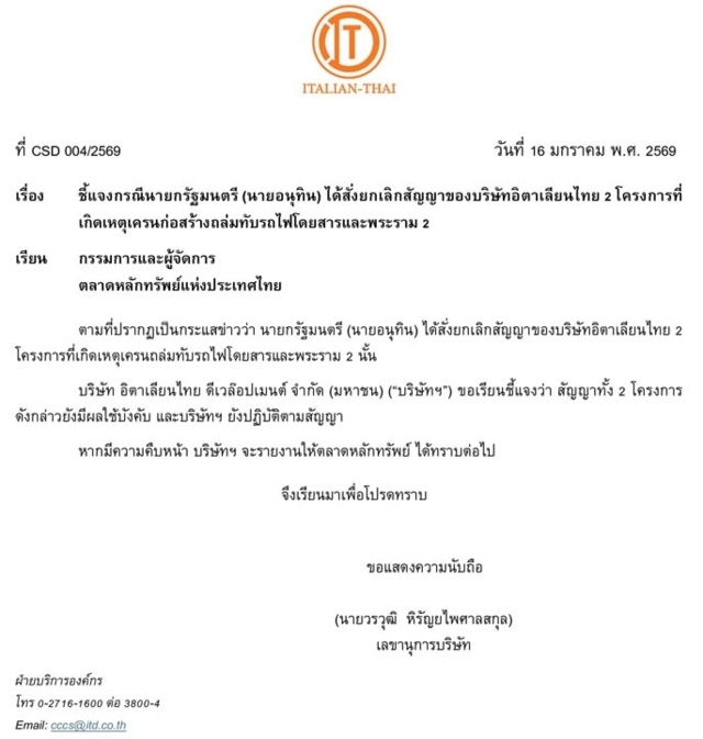 วันที่ 16 มกราคม 69 บริษัท อิตาเลียนไทย ดีเวล็อปเมนต์ จำกัด (มหาชน) (ITD) แจ้งตลาดหลักทรัพย์แห่งประเทศไทย ว่า ตามที่ปรากฏเป็นกระแสข่าวว่านายกรัฐมนตรี (นายอนุทิน ชาญวีรกูล) ได้สั่งยกเลิกสัญญาของบริษัท อิตาเลียนไทย 2 โครงการที่เกิดเหตุเครนถล่มทับรถไฟไฟโดยสาร และพระราม 2 นั้นบริษัทขอชี้แจงว่า สัญญาทั้ง 2 โครงการดังกล่าวยังมีผลใช้บังคับ และบริษัทยังปฏิบัติตามสัญญา หากมีความคืบหน้าจะรายงานให้ตลาดหลักทรัพย์ฯ ได้ทราบต่อไป