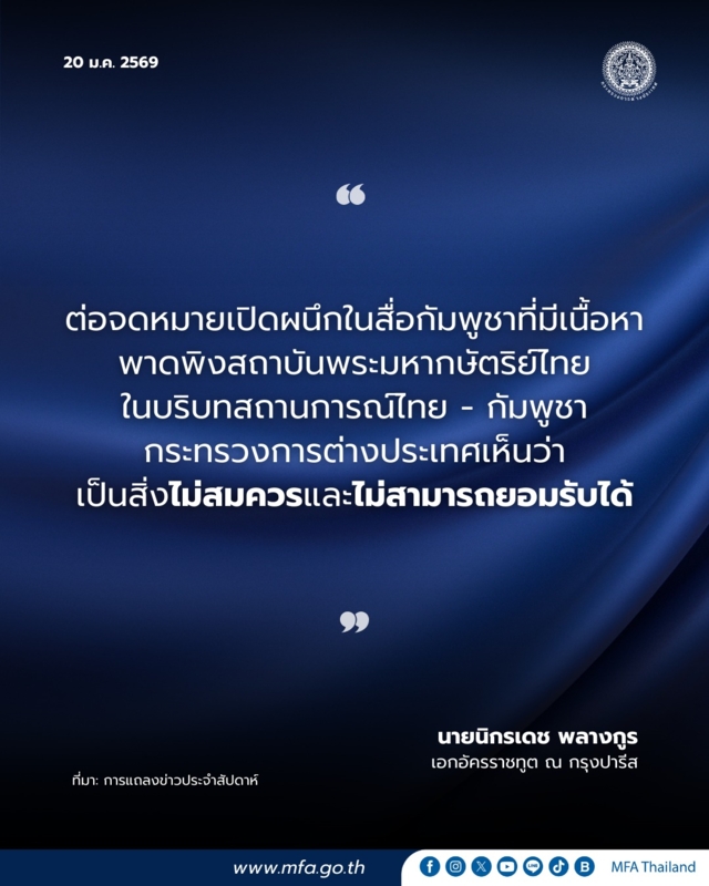 ล่าสุดปรากฏรายงานข่าวในสื่อกัมพูชาอีกครั้งหนึ่ง ตีพิมพ์จดหมายเปิดผนึก จากสมาชิกวุฒิสภาท่านหนึ่งของกัมพูชา ซึ่งมีเนื้อหาพาดพิงสถาบันพระมหากษัตริย์ไทยในบริบทสถานการณ์ไทย-กัมพูชา ท่านรัฐมนตรีสีหศักดิ์ ซึ่งขณะนี้อยู่ในระหว่างการปฎิบัติราชการอยู่ที่การประชุม World Economic Forum (WEF) ที่เมืองดาวอส ประเทศสวิตเซอร์แลนด์ ได้สั่งการให้กระทรวงการต่างประเทศดำเนินการชี้แจงทันที เพื่อสร้างความเข้าใจที่ถูกต้องในเรื่องนี้