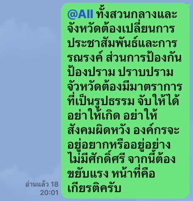 และขอให้ทั้งส่วนกลางและจังหวัดต้องเปลี่ยนการประชาสัมพันธ์และการรณรงค์ส่วนการป้องกัน ป้องปราม ปราบปรามจังหวัดต้องมีมาตราการที่เป็นรูปธรรม จับให้ได้ อย่าให้เกิด อย่าให้สังคมผิดหวังองค์กรจะอยู่ยาก หรืออยู่อย่างไม่มีศักดิ์ศรี จากนี้ต้องขยับแรง หน้าที่คือเกียรติ