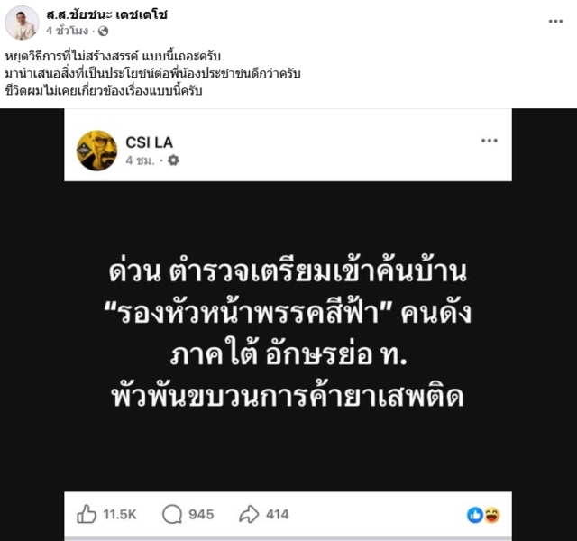 จากกรณีเพจเฟซบุ๊ก "CSI LA" โพสต์ข้อความระบุว่า "ด่วน ตำรวจเตรียมเข้าค้นบ้าน “รองหัวหน้าพรรคสีฟ้า” คนดังภาคใต้ อักษรย่อ ท. พัวพันขบวนการค้ายาเสพติด"