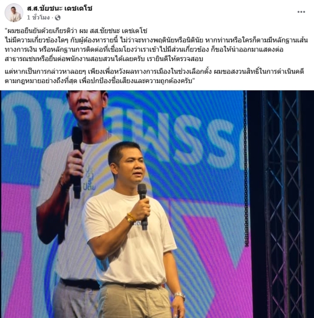 จากนั้นนายชัยชนะ ก็ได้โพสต์ ย้ำอีกว่า "ผมขอยืนยันด้วยเกียรติว่า ผม สส.ชัยชนะ เดชเดโช
