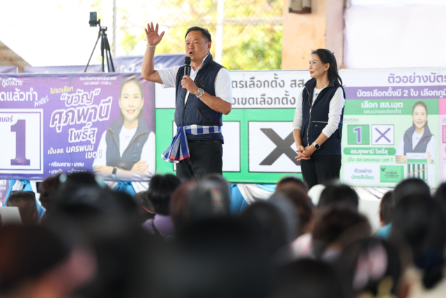 ระหว่างนั้น ชาวบ้านตะโกน ว่า เลือกวันนี้เลยได้หรือไม่ แต่นายอนุทิน ตอบว่า เลือกไม่ได้ เพราะเป็นบัตรเถื่อน ต้องเลือกวันที่ 8 กุมภาพันธ์ แต่ขออย่าเปลี่ยนใจ ตั้งแต่วันนี้ 21 มกราคม จนถึงวันที่ 8 กุมภาพันธ์ ให้เลือกขวัญ ศุภพานี โพธิ์สุ และอย่าลืมเลือกเบอร์ 37 ไม่เช่นนั้น ตนมานครพนมไม่ได้อายเขา