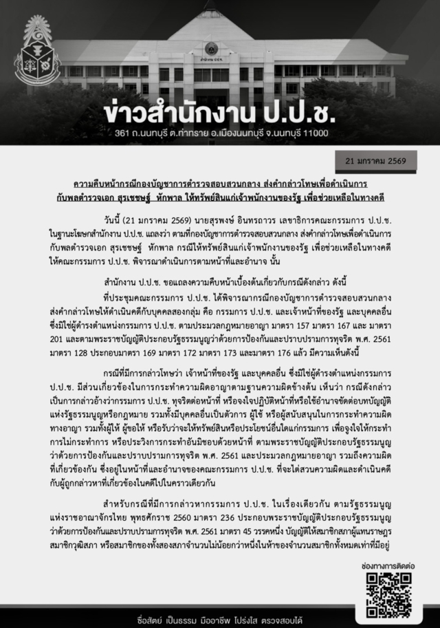 วันที่ 21 ม.ค. 69 นายสุรพงษ์ อินทรถาวร เลขาธิการคณะกรรมการป้องกันและปราบปรามการทุจริตแห่งชาติ (ป.ป.ช.) ในฐานะโฆษกสำนักงาน ป.ป.ช. แถลงว่า ตามที่กองบัญชาการตำรวจสอบสวนกลาง ส่งคำกล่าวโทษเพื่อดำเนินการกับ พล.ต.อ.สุรเชษฐ์ หักพาล กรณีให้ทรัพย์สินแก่เจ้าพนักงานของรัฐ เพื่อช่วยเหลือในทางคดี ให้คณะกรรมการ ป.ป.ช. พิจารณาดำเนินการตามหน้าที่และอำนาจ