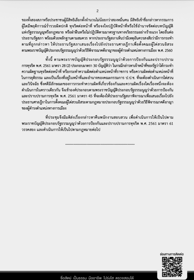 ที่ประชุมจึงมีมติส่งเรื่องกล่าวหาคืนพนักงานสอบสวน เพื่อดำเนินการให้เป็นไปตามพระราชบัญญัติประกอบรัฐธรรมนูญว่าด้วยการป้องกันและปราบปรามการทุจริต พ.ศ. 2561 มาตรา 61 วรรคสอง และดำเนินการให้เป็นไปตามกฎหมายต่อไป