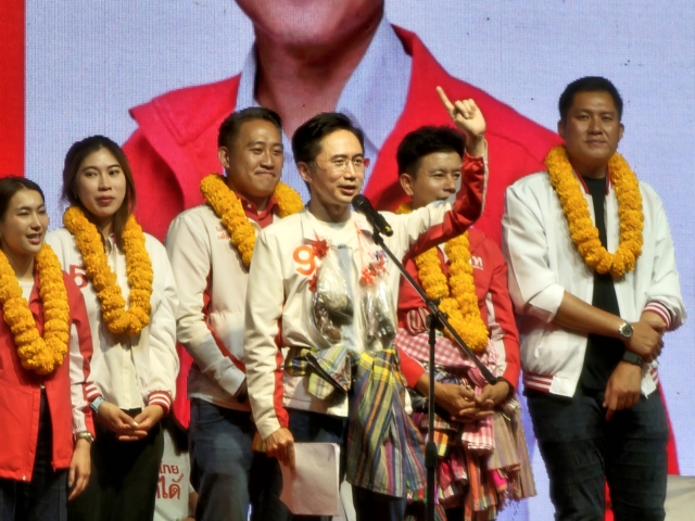 ด้านนายสุทิน คลังแสง ผู้สมัครสส. บัญชีรายชื่อ ขึ้นปราศรัยอย่าง โดยย้ำว่าการเลือกตั้งครั้งนี้ต้องเลือกแบบยกทีมทั้งจังหวัด ขณะนี้เริ่มมีข่าวเรื่องเงินสีเทาไหลเข้ามาเพื่อซื้อเสียงพี่น้อง มีตัวเลขลือกันถึง 7,500 บาท แต่ถึงมือชาวบ้านจริงอาจเหลือ 2,000-3,000 บาท ตนจึงขอแนะนำพี่น้องชาวมหาสารคามว่า เงินเหล่านี้เป็นเงินที่ได้มาโดยไม่สุจริต เป็นเงินสีเทาที่เขานำมาแจก ดังนั้น ให้รับเงินเขาไว้ แต่อย่ากาให้เขา ให้รับเงินสีเทานั้นมา แล้วเข้าคูหาไปกาพรรคสีแดง เพื่อสั่งสอนหัวคะแนนที่อมเงิน และเพื่อเลือกอนาคตที่ดีกว่า ขอให้เลือกเพื่อไทยทั้ง 2 ใบ ให้แลนด์สไลด์จัดตั้งรัฐบาลได้สำเร็จ