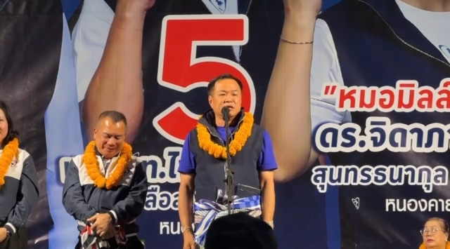 นายอนุทิน กล่าวต่อว่า การเลือกตั้งใน จ.หนองคาย ครั้งนี้พรรคภูมิใจไทยขอเสนอเป็นแพ็กเกจ ทั้งนางจิดาภา พล.ต.ท.ไพศาล และนายศักดิ์ดา หนองคายถ้าไม่เจริญยุคนี้จะเจริญยุคไหน วันนี้ตนไม่เหมือน 4-5 ปีที่แล้ว ที่มาเจอพ่อแม่พี่น้องตรงนี้ เพราะตอนนั้นเวลาจะรับปากใครว่าจะเป็นนายกฯยังดูห่างเกินไป ขอเป็นนายกก่อนฯแล้วก็มาพบกับพ่อแม่พี่น้องเพื่อเป็นนายกฯต่อไป วันนี้ตนไม่ได้มาขายฝัน แต่ได้ทำให้ความจริงเกิดขึ้นแล้ว จึงมาบอกกับพ่อแม่พี่น้องทุกคน และยืนยันว่า ตนไม่ได้ลืมหนองคาย แม้ว่าครั้งที่ผ่านมา จะไม่ได้ให้โอกาสพรรคภูมิใจไทย ตนก็ไม่ลืมจังหวัดหนองคาย ถามว่าวันนี้มีกี่ขัวแล้ว ที่หนองคายมีทั้งขัวรถบรรทุก และขัวรถไฟ ตอนนั้นตนคุมคมนาคม เขาบอกต้องรอ 7-8 ปี ถึงจะมีขัวรถไฟ แต่ตนบอกว่าไม่ได้ต้องเกิดขึ้นสมัยที่พรรคภูมิใจไทย คุมคมนาคม