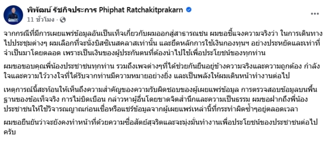 วันที่ 27 ม.ค.2569 นายพิพัฒน์ รัชกิจประการ รองนายกรัฐมนตรีและรัฐมนตรีว่าการกระทรวงคมนาคม ได้โพสต์เฟซบุ๊กชี้แจงว่า จากกรณีที่มีการเผยแพร่ข้อมูลอันเป็นเท็จเกี่ยวกับผมออกสู่สาธารณชน ผมขอชี้แจงความจริงว่า ในการเดินทางไปประชุมต่างๆ ผมเลือกที่จะนั่งบิสซิเนสคลาสเท่านั้น และยึดหลักการใช้เงินกองทุนฯ อย่างประหยัดและเท่าที่จำเป็นมาโดยตลอด เพราะเป็นเงินของผู้ประกันตนที่ต้องนำไปใช้เพื่อประโยชน์ของทุกท่าน