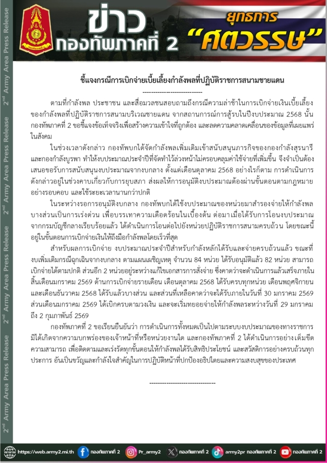 (28 ม.ค. 2569) กองทัพภาคที่ 2 ชี้แจง กรณีการเบิกจ่ายเบี้ยเลี้ยงกำลังพลที่ปฏิบัติราชการสนามชายแดน ตามที่กำลังพล ประชาชน และสื่อมวลชนสอบถามถึงกรณีความล่าช้าในการเบิกจ่ายเงินเบี้ยเลี้ยงของกำลังพลที่ปฏิบัติราชการสนามบริเวณชายแดน จากสถานการณ์การสู้รบในปีงบประมาณ 2568 นั้น กองทัพภาคที่ 2 ขอชี้แจงข้อเท็จจริงเพื่อสร้างความเข้าใจที่ถูกต้อง และลดความคลาดเคลื่อนของข้อมูลที่เผยแพร่ในสังคม