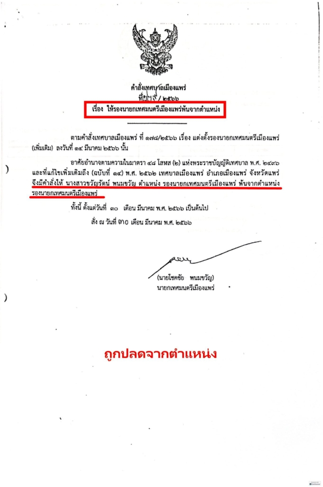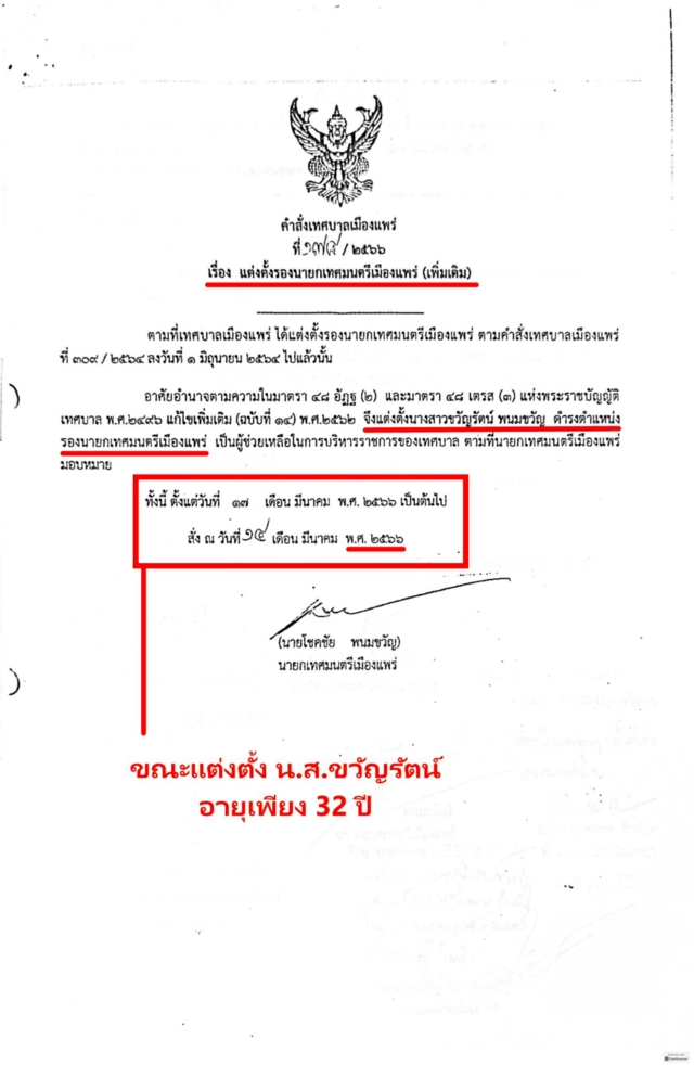 แต่งตั้งโดย นายโชคชัย พนมขวัญ อาแท้ๆ ที่เป็นนายกเทศมนตรีเมืองแพร่