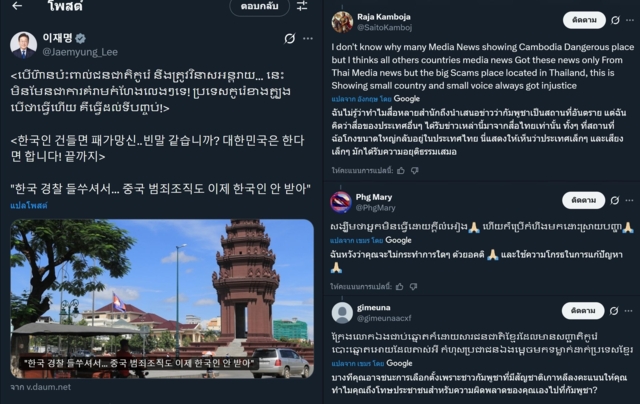 วันที่ 30 ม.ค. 69 เฟซบุ๊กเพจ “Army Military Force” โพสต์ข้อความระบุว่า เดือด! ประธานาธิบดีเกาหลีใต้ "อี แจ-มย็อง" โพสต์ข้อความเป็นภาษากัมพูชาบน X ส่วนตัวว่า "หาก (คนเขมร) กล้าทำร้ายชาวเกาหลีเมื่อไร พวกแกต้องชิบหายแน่นอน และนี่ไม่ใช่แค่คำขู่เล่นๆ หรือไร้สาระ! เกาหลีใต้ เอาจริง หากเราลงมือแล้ว เราจะทำให้ถึงสุดแน่นอน!"