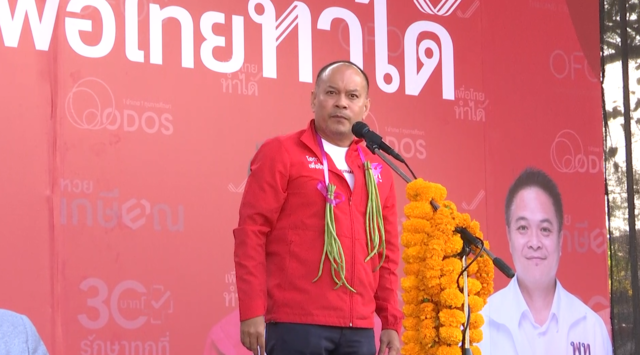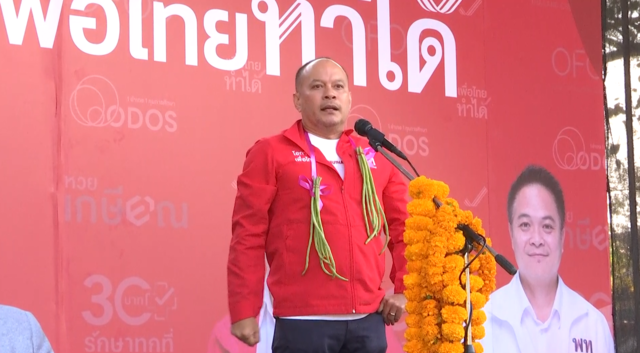 การปราศรัยบนเวที บอกว่าถ้าเลือกสองครั้งซึ่งหมายถึงพระสีแดงสีส้ม เท่ากับเลือกตามที่กัมพูชาเลือก ยืนยันว่าไม่จริง เพราะรัฐมนตรีคนนั้นของประเทศเพื่อบ้านที่พูดมา ไม่รู้ว่าเจตนาหาแนวร่วม หาคะแนนให้นายแนุทินหรือไม่ แต่พรรคเพื่อไทยเดินมากับประชาชน พิสูจน์ด้วยผลงายและนโยบายมาตลอด 20 ปี โดนกระทำ ไม่เคยท้อ พรรคเพื่อไทยยืนหยัดอยู่จุดนี้
