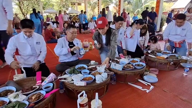 ต่อมา คณะของ น.ส.แพทองธาร เดินทางไปยังหมู่บ้านเหนือนครจันทึก ต.สีคิ้ว อ.สีคิ้ว เพื่อเยี่ยมชมกลุ่มทอผ้าซิ่นยวน โดยมีกลุ่มสตรีคนไทยเชื้อสายยวนที่ย้ายถิ่นจากภาคเหนือมาอยู่ที่ อ.สีคิ้ว มาคอยต้อนรับจำนวนมาก จากนั้นได้ร่วมรับประทานอาหารกลางแบบขันโตกกับกลุ่มสตรีทอผ้าซิ่นยวนอย่างเป็นกันเอง และเดินทางต่อไปยังวัดธรรมจักรเสมาราม อ.สูงเนิน เพื่อมนัสการพระนอนหินทรายอายุกว่า 1300 ปี สิ่งศักดิ์สิทธิ์ของ จ.นครราชสีมา และเดินทางต่อไปยัง วัดป่าธรรมดา อ.บัวลาย จ.นครราชสีมาเพื่อช่วย นางพัชราวรรณ ภิญโญ ผู้สมัคร สส.นครราชสีมา เขตเลือกตั้งที่ 6 พรรคเพื่อไทยหาเสียง ท่ามกลางประชาชนที่มารอต้อนรับเป็นจำนวนมาก
