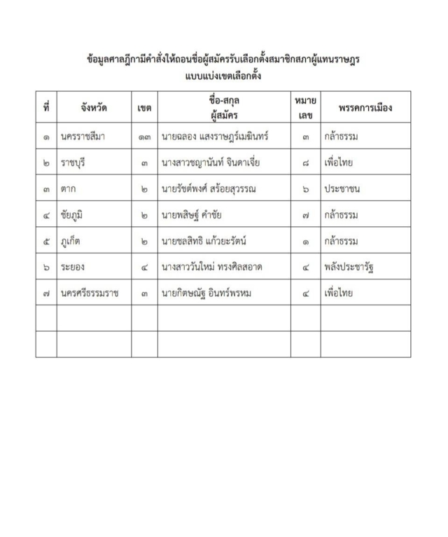 จากข้อมูลล่าสุด ศาลฎีกาได้มีคำสั่งให้ถอนชื่อผู้สมัครรับเลือกตั้ง สส.แบบแบ่งเขตเลือกตั้ง ตามที่ ผอ.การเลือกตั้งประจำเขตเลือกตั้ง พบว่าผู้สมัครใดขาดคุณสมบัติหรือมีลักษณะต้องห้าม ดังนี้