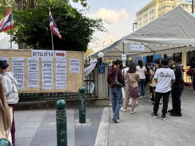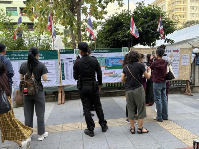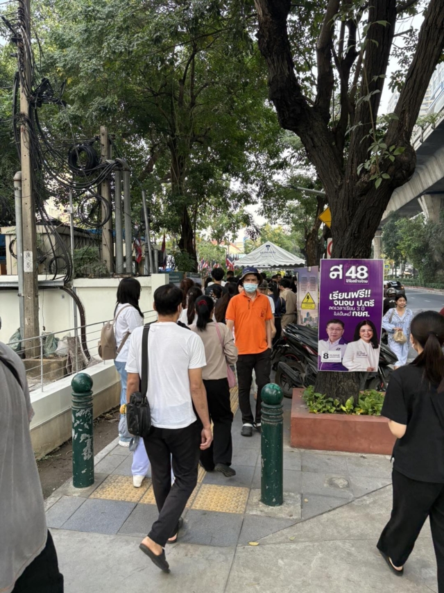 ส่วนใหญ่เกือบทั้งหมดน่าจะเป็นคนต่างจังหวัดที่มาทำงาน กทม. ยังไม่ถึงหนาแน่น สิ่งที่ทำได้ดี : ป้ายต่าง ๆ เพื่อชี้แจงการใช้สิทธิ ทำได้ชัดเจน มีแบ่งพื้นที่ใช้สิทธิของผู้ที่มาจากจังหวัดต่าง ๆ มี QR code ให้ Scan เพื่อตรวจสอบสิทธิ แต่ยังมีขนาดเล็ก น้อยจุด มีโต๊ะพร้อม จนท. และโน้ตบุ๊ค อำนวยความสะดวกสำหรับคนที่ไม่ต้องการตรวจด้วยตัวเอง มี จนท. ถือโทรโข่งประชาสัมพันธ์ เป็นจุด ๆ