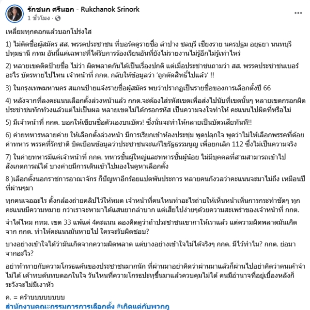 1) ไม่ติดชื่อผู้สมัคร สส. พรรคประชาชน ที่บอร์ดดูรายชื่อ ลำปาง ชลบุรี เชียงราย นครปฐม อยุธยา นนทบุรี ปทุมธานี กทม อันนี้แค่เฉพาะที่ได้รับการร้องเรียนอันที่ยังไม่รายงานไม่รู้อีกไม่รู้เท่าไหร่