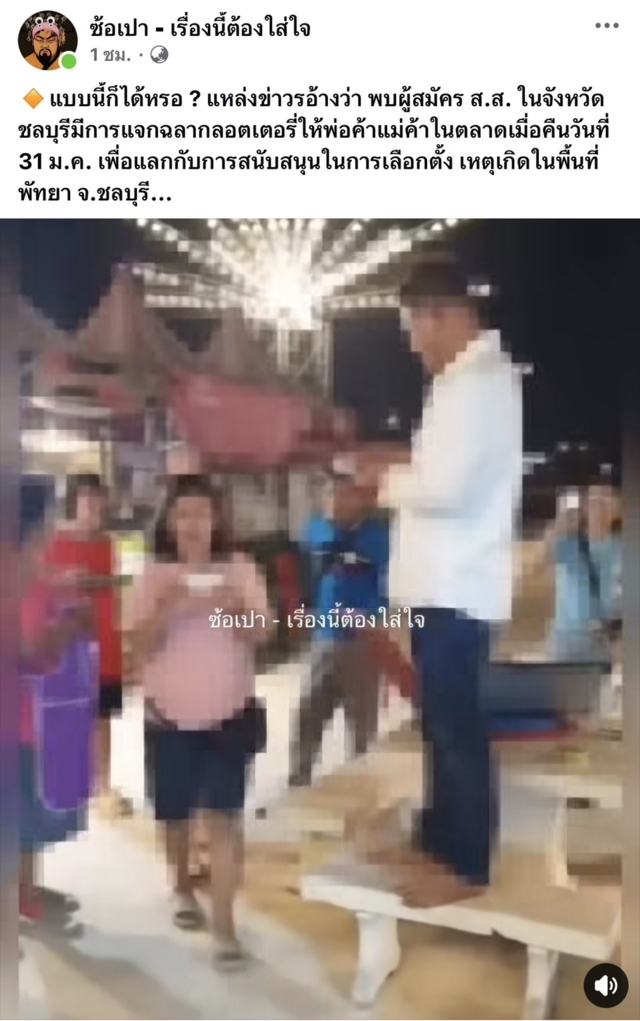 วันที่ 2 ก.พ.2569 จากกรณีที่มีเพจดังชื่อว่าซ้อเปา-เรื่องนี้ต้องใส่ใจได้โพสต์ข้อความว่า “แบบนี้ก็ได้เหรอ?แหล่งข่าวรอ้างว่าพบผู้สมัครสส.ในจังหวัดชลบุรี มีการแจกฉลากลอตเตอรี่ ให้พ่อค้าแม่ค้าในตลาดเมื่อคืนวันที่ 31 ม.ค.เพื่อแลกกับการสนับสนุนในการเลือกตั้งเหตุเกิดในพื้นที่พัทยา จ.ชลบุรี” พร้อมกับคลิปภาพชายสวมเสื้อเชิ้ตสีขาว กางเกงขายาว แจกฉลากกินแบ่งรัฐบาล ให้กับพ่อค้าแม่ค้าที่มายืนรอแถวรับลอตเตอรี ในช่วงเวลา 21.40 น.ของคืนวันที่ 31 มกราคม 2569 ซึ่งเป็นคืนก่อนวันเลือกตั้งล่วงหน้า