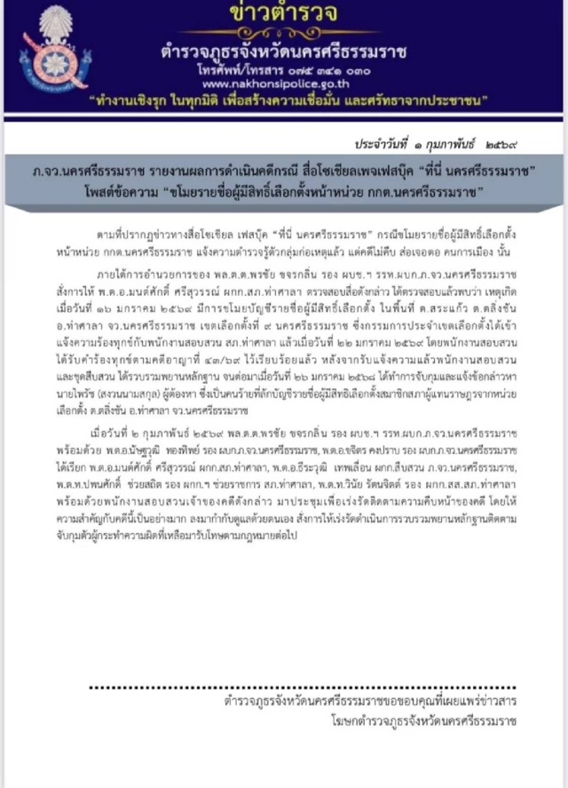 ภายใต้การอำนวยการของ พล.ต.ต.พรชัย ขจรกลิ่น รอง ผบช.ฯ รรท.ผบก.ภ.จว.นครศรีธรรมราช สั่งการให้ พ.ต.อ.มนต์ศักดิ์ ศรีสุวรรณ์ ผกก.สภ.ท่าศาลา ตรวจสอบสื่อดังกล่าว ได้ตรวจสอบแล้วพบว่า เหตุเกิดเมื่อวันที่ 16 มกราคม 2569 มีการขโมยบัญชีรายชื่อผู้มีสิทธิ์เลือกตั้ง ในพื้นที่ ต.สระแก้ว ต.ตลิ่งชัน อ.ท่าศาลา จว.นครศรีธรรมราช เขตเลือกตั้งที่ 9 นครศรีธรรมราช ซึ่งกรรมการประจำเขตเลือกตั้งได้เข้าแจ้งความร้องทุกข์กับพนักงานสอบสวน สภ.ท่าศาศาลา แล้วเมื่อวันที่ 22 มกราคม 2569 โดยพนักงานสอบสวนได้รับคำร้องทุกข์ตามคคีอาญาที่ 43/69 ไว้เรียบร้อยแล้ว