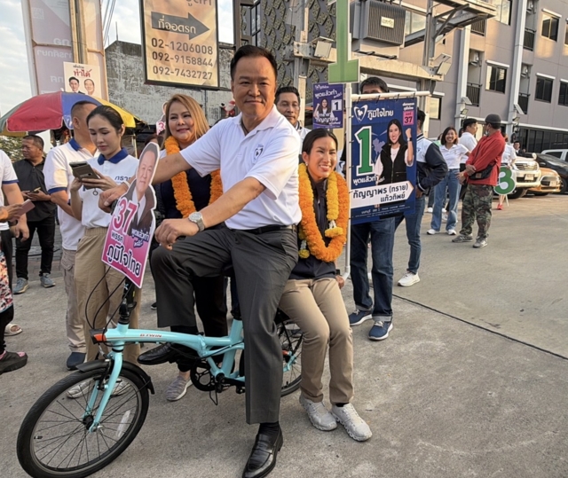 จากนั้นนายอนุทิน ได้เดินไปขึ้นคร่อมจักรยานที่มีป้ายหาเสียงเป็นรูปนายอนุทิน พร้อมหมายเลข 37 โดยมีน.ส.กัญญาพร ผู้สมัครสส.นั่งซ้อนท้าย ก่อนปั่นจักรยานในบริเวณดังกล่าว