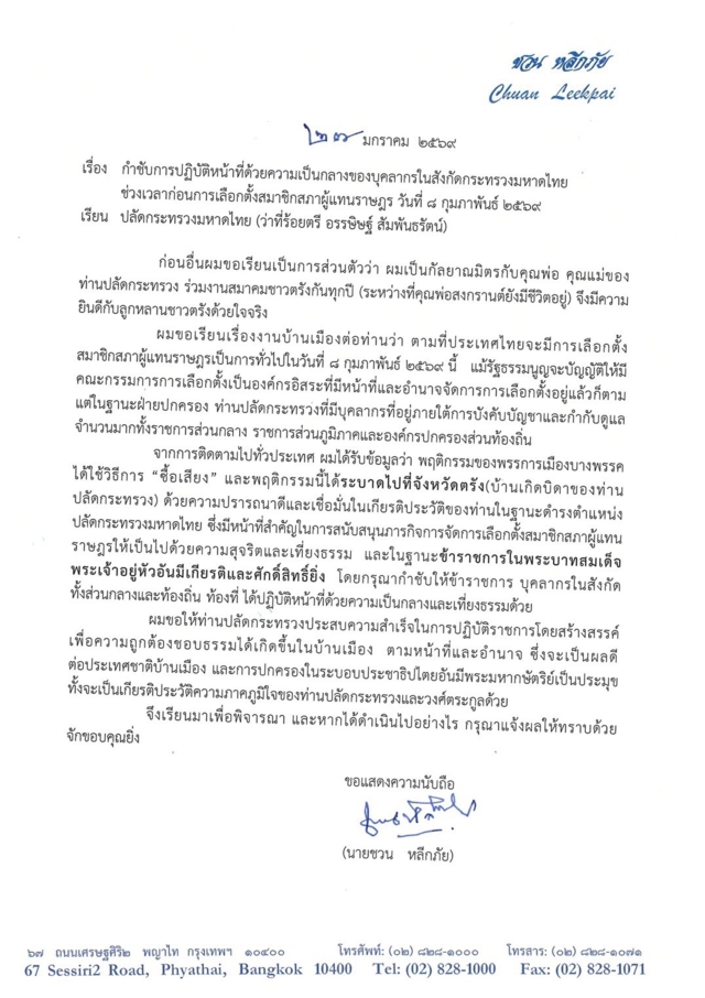 วันที่ 3 ก.พ.2569 ผู้สื่อข่าวรายงานว่า นายชวน หลีกภัย อดีตนายกรัฐมนตรี ในฐานะผู้สมัคร สส. บัญชีรายชื่อ พรรคประชาธิปัตย์ ได้ทำหนังสือไปยังปลัดกระทรวงมหาดไทย ขอให้กำชับข้าราชการในสังกัด ทั้งส่วนกลาง ส่วนภูมิภาค ท้องที่ รวมทั้งองค์กรปกครองส่วนท้องถิ่น ปฎิบัติหน้าที่ด้วยความเป็นกลาง และเที่ยงธรรม กรณีมีกระแสข่าวเจ้าหน้าที่ของรัฐ โดยเฉพาะในระดับท้องที่ เช่นกำนันผู้ใหญ่บ้าน และท้องถิ่น ในหลายจังหวัดเป็นกลไกในการร่วมมือกับนักการเมืองบางกลุ่มซื้อสิทธิ์ขายเสียง