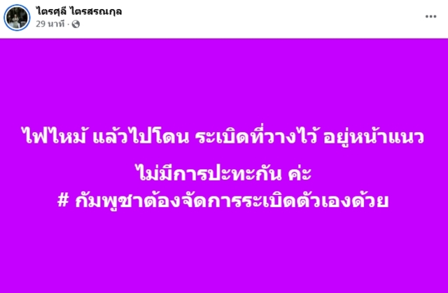 ล่าสุด นางสาวไตรศุลี ไตรสรณกุล เลขาธิการนายกรัฐมนตรี ได้โพสต์เฟซบุ๊ก ระบุข้อความว่า ไฟไหม้ แล้วไปโดน ระเบิดที่วางไว้ อยู่หน้าแนว ไม่มีการปะทะกัน ค่ะ # กัมพูชาต้องจัดการระเบิดตัวเองด้วย