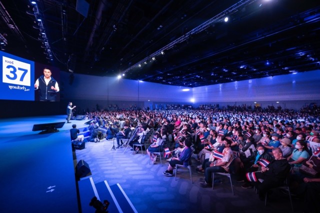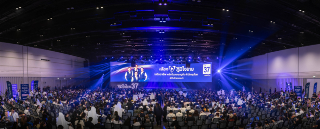 ขณะที่บริเวณด้านหน้า มีการติดตั้ง จอLED ขนาดใหญ่ ฉายภาพและข้อความ "พูดแล้วทำ พลัส" สโลแกนหาเสียงของพรรคภูมิใจไทย และยังมีการตกแต่งแบคดรอปหมายเลข 37 และ นโยบายต่างๆ ของพรรค เช่น ทหารอาสา , พยาบาลอาสา , การศึกษาพลัส และคนละครึ่งพลัส โดยในพื้นที่อาศัยมีการจัดเตรียมที่นั่งกว่า 2,000 ที่นั่ง