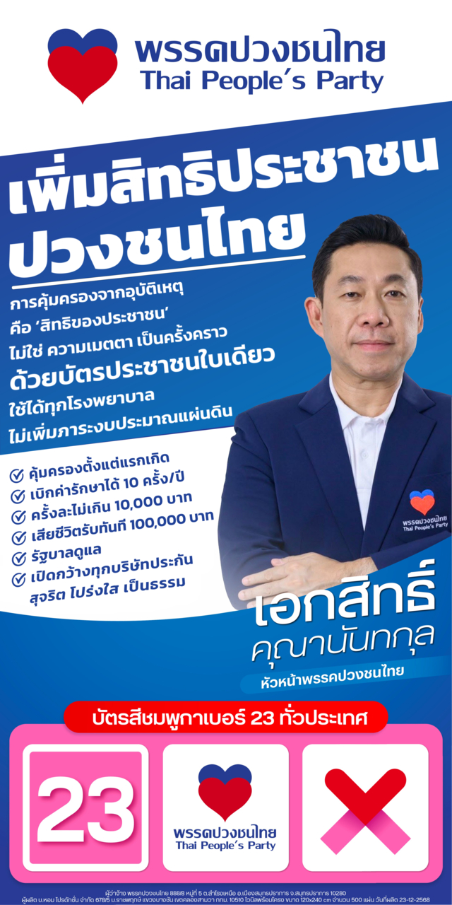 นาย เอกสิทธิ์ คุณานันทกุล หัวหน้าพรรคปวงชนไทย ระบุว่า อุบัติเหตุไม่เคยเลือกเวลาเกิดและไม่เคยถามฐานะทางการเงินของผู้ประสบเหตุ ดังนั้นรัฐต้องมีคำตอบที่เป็นระบบให้กับประชาชน นโยบายนี้จึงมุ่งทำให้ “สิทธิอุบัติเหตุขั้นพื้นฐาน” เกิดขึ้นจริง เพื่อให้คนไทยมั่นใจได้ว่า เมื่อเกิดเหตุไม่คาดฝัน จะมีระบบคุ้มครองรองรับอย่างทั่วถึงและเป็นธรรม