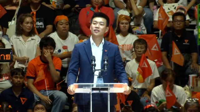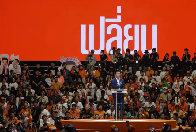 นายณัฐพงษ์ เรืองปัญญาวุฒิ หัวหน้าพรรคและแคนดิเดตนายกรัฐมนตรีพรรคประชาชน ปราศรัยว่า ตนอยากถามเพิ่มเติมความตั้งใจของทุกคนอีกครั้งว่าวันนี้ทุกท่านจะใช้ปากกาของทุกคนตัดสินใจกาอย่างไร ระหว่างแบบแรก จะใช้ปากกาตัดสินใจกาเพียงเพื่อป้องกันยืนยันความเชื่อเดิมๆ ความเชื่อที่จะใครนิยามตนเองว่า ต่อสู้เพื่อสีไหนก็ตาม หรือบอกว่าฉันรักชาติมากที่สุด หรือว่าจะเลือกกากบาทไปที่สีเสื้อ ที่ท่านเคยนิยามตนเองว่า ต่อสู้เพื่อประชาธิปไตย ซึ่งความเชื่อที่กากบาทในอดีตนั้นไม่ใช่สิ่งผิด แต่ความรักชาติและประชาธิปไตยสามารถเดินหน้าไปข้างหน้าพร้อมกันได้ ซึ่งนายชัยธวัช ตุลาธน ผู้ช่วยหาเสียง ได้เตือนสติให้ทุกคนแล้วว่า ‘มีช้างตัวเดียวกัน’ ช้างตัวนั้นคือบรรดาชนชั้นนําที่ยึดกลุ่ม ถือครองอํานาจทางการเมืองในประเทศ