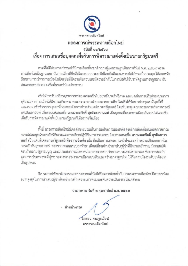 แถลงการณ์ดังกล่าวลงนามโดย นายราเชน ตระกูลเวียง หัวหน้าพรรคทางเลือกใหม่ ประกาศ ณ วันที่ 6 ก.พ. 2569